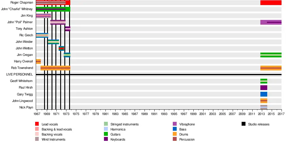 ![]() The original formation of the band. Left to right: John "Charlie" Whitney (guitars), Jim King (saxophones, vocals, harmonica), Rob Townsend (drums), Ric Grech (bass, vocals, violin), Roger Chapman (vocals) | |