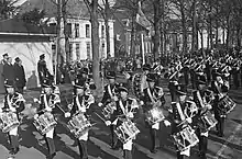 The Fanfare Band of the Royal Marechaussee (Dutch: Trompetterkorps der Koninklijke Marechaussee, TkKMar) is a 60-member fanfare band which serves as the official ensemble of the Dutch Royal Marechaussee. It is currently led by Captain Peter Kleine Schaars.[1] It is currently based in Apeldoorn (specifically William III Barracks). Being a professional military band representing a service branch of the Dutch Armed Forces, it consists of many different ensembles, including a saxophone quartet, and a percussion section. Also, it maintains a drum and bugle corps component.