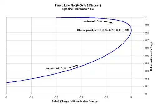 The equation above can be used to plot the Fanno line, which represents a locus of states for given Fanno flow conditions on an H-ΔS diagram. In the diagram, the Fanno line reaches maximum entropy at H = 0.833 and the flow is choked. According to the Second law of thermodynamics, entropy must always increase for Fanno flow. This means that a subsonic flow entering a duct with friction will have an increase in its Mach number until the flow is choked. Conversely, the Mach number of a supersonic flow will decrease until the flow is choked. Each point on the Fanno line corresponds with a different Mach number, and the movement to choked flow is shown in the diagram.
