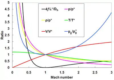 Differential equations can also be developed and solved to describe Fanno flow property ratios with respect to the values at the choking location. The ratios for the pressure, density, temperature, velocity and stagnation pressure are shown below, respectively. They are represented graphically along with the Fanno parameter.
