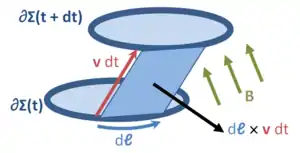 This is the most difficult part of the proof; more details and alternate approaches can be found in references.[5][6][7] As the loop moves and/or deforms, it sweeps out a surface (see figure on right). The magnetic flux through this swept-out surface corresponds to the magnetic flux that is either entering or exiting the loop, and therefore this is the magnetic flux that contributes to the time-derivative. (This step implicitly uses Gauss's law for magnetism: Since the flux lines have no beginning or end, they can only get into the loop by getting cut through by the wire.) As a small part of the loop moves with velocity v for a short time , it sweeps out a vector area vector . Therefore, the change in magnetic flux through the loop here is