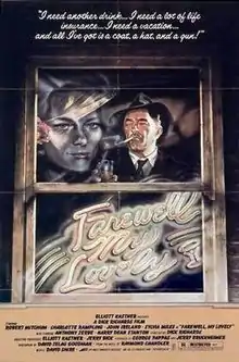 Farewell, My Lovely is a 1975 American neo-noir[3] crime thriller film directed by Dick Richards and featuring Robert Mitchum as private detective Philip Marlowe. The picture is based on Raymond Chandler's novel Farewell, My Lovely (1940), which had previously been adapted for film as Murder, My Sweet in 1944.[4] The supporting cast features Charlotte Rampling, John Ireland, Jack O'Halloran, Sylvia Miles and Harry Dean Stanton, with an early screen appearance by Sylvester Stallone, and hardcore crime novelist Jim Thompson, in his only acting role, as Charlotte Rampling's character's elderly husband Judge Grayle. Mitchum returned to the role of Marlowe three years later in the 1978 film The Big Sleep, making him the only actor to portray the character more than once in a feature film.