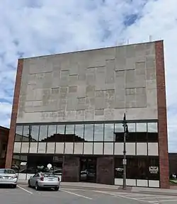 Des Moines architect Gerald I. Griffith was responsible for designing both phases of the Modern Movement structure. Both phases were built by the Lovejoy Construction Company, also of Des Moines. The main facade is composed of gray shot-sawn Indiana limestone panels. The lower two floors feature bands of windows. The upper two floors are all stone veneer that is ornamented with a random patterning of projecting panels that have been sand blasted to a smoother surface, with shot-sawn panels.[2] The building was listed on the National Register of Historic Places in 2013.[1]