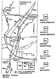 The Farmville Basin lies in Virginia spreading North from Farmville, through Cumberland from modern day Cumberland State Forest to Briery Creek with a little bit in Buckingham.[1]
