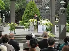 In the 1970s, the 228 Justice and Peace Movement was initiated by several citizen groups to ask for a reversal of this policy and in 1992, the Executive Yuan promulgated the "February 28 Incident Research Report." Then-president and KMT chairman Lee Teng-hui, who had participated in the incident and was arrested as an instigator and a Communist sympathizer, made a formal apology on behalf of the government in 1995 and declared February 28 a day to commemorate the victims.[35] Among other memorials erected, Taipei New Park was renamed 228 Memorial Park.