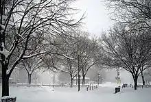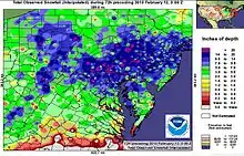 The February 9–10, 2010 North American blizzard was a winter and severe weather event that afflicted the Midwest, Mid-Atlantic and New England regions of the United States between February 9–11, 2010, affecting some of the same regions that had experienced a historic Nor'easter three days prior. The storm brought 10 to 20 inches (25 to 51 cm) of snow across a wide swath from Washington, DC to New York City, with parts of the Baltimore metro area receiving more than 20 inches (51 cm).[1] This storm began as a classic "Alberta clipper", starting out in Canada and then moving southeast, and finally curving northeast while rapidly intensifying off the New Jersey coast, forming an eye. The National Weather Service, in an interview with The Baltimore Sun's weather reporter Frank Roylance, likened this storm to a Category 1 hurricane. Forecasters told Roylance that "Winds topped 58 mph over part of the Chesapeake Bay, and 40 mph gusts were common across the region as the storm's center deepened and drifted slowly along the mid-Atlantic coast".[2] This storm system, in conjunction with the first storm 3 days prior, has been nicknamed Snoverkill.