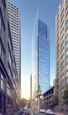 In April 2015, it was announced that the winning bidder of the auction was Martin Selig Real Estate.[40] The firm announced plans to build a 31-story office tower, designed by Perkins and Will, and incorporating the existing building as the skyscraper's podium with a 3-story winter garden separating the historic building from the addition.[41]