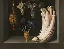 Still Life with Cardoon, Francolin, Grapes and Irises by Felipe Ramírez, Museo del Prado, 1628