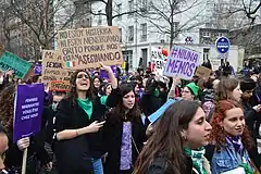 In the 2000s, some feminist groups such as Ni putes, ni soumises (Neither Whores, Nor Submissives) denounced an increased influence of Islamic extremism in poor suburbs of large immigrant population, claiming they may be pressured into wearing veils, leaving school, and marrying early.[39] On the other hand, a "third wave" of the feminist movement arose, combining the issues of sexism and racism, protesting the perceived Islamophobic instrumentalization of feminism by the French Right.