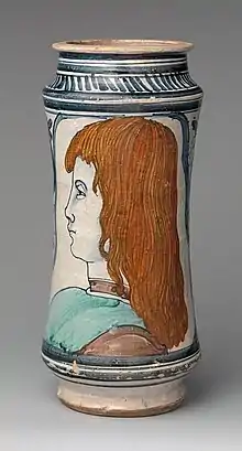 Neapolitan Albarello with a probable childish portrait of Ferrandino, then Prince of Capua. There you can recognize the unmistakable flowing hair also present in his other portraits. The year 1475-1480 approximately.
