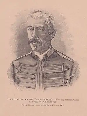 Fernando de Magalhães e Menezes. ComTE, CvC, CvA, OSE (30 October 1846 – 23 September 1919) was a Portuguese colonial administrator and a military officer. He was also Chief of Staff during the 31 January 1891 revolt.