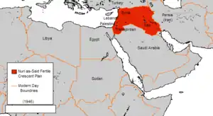 The Fertile Crescent Plan was an Iraqi Hashemite proposal for the union of the Kingdom of Iraq with Mandatory Syria (including Mandatory Lebanon), Mandatory Palestine, and Transjordan. Nuri as-Said, prime minister of Iraq, presented the plan to British officials during World War II, when it appeared that France had become too weak to hold on to Syria.
