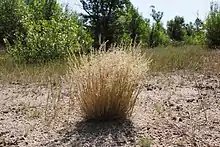 The plant is perennial and caespitose with erect culms that are 20–60 centimetres (7.9–23.6 in) long. They are also clumped and have light brown coloured butt sheaths. The ligule is going around the eciliate membrane with the leaf sheaths being open and hairy. Leaf-blades are filiform, conduplicate, light green in colour, and are 0.3–0.7 centimetres (0.12–0.28 in) broad. They also have smooth surface and peduncle. The panicle is linear, open, inflorescenced and is 6–14 centimetres (2.4–5.5 in) long.[2]