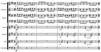 In September he described the music to Ysaÿe as "an experiment in the different combinations that can be achieved with one colour—what a study in grey would be in painting".[10][13] Whistler's most famous painting was a portrait of his mother called Arrangement in Grey and Black No. 1.[2] Debussy scored the orchestral part of the first of the three pieces for strings alone; the second for three flutes, four horns, three trumpets, and two harps; and the third for the two groupings together.[13][2] The first version of the Nocturnes seems to be the one described; he later abandoned the idea of the solo violin arrangement when he was unable to get Ysaÿe to undertake the performance.[10]