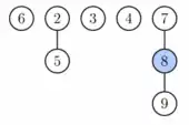 ![]() Figure 2. Fibonacci heap from Figure 1 after first phase of extract minimum. Node with key 1 (the minimum) was deleted and its children were added as separate trees. | ![]() Figure 3. Fibonacci heap from Figure 1 after extract minimum is completed. First, nodes 3 and 6 are linked together. Then the result is linked with tree rooted at node 2. Finally, the new minimum is found. | ![]() Figure 4. Fibonacci heap from Figure 1 after decreasing key of node 9 to 0. This node as well as its two marked ancestors are cut from the tree rooted at 1 and placed as new roots. |