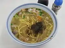 Filipino soups tend to be very hearty and stew-like containing large chunks of meat and vegetables or noodles. They are usually intended to be filling and not meant to be a light preparatory introduction for the main course. They tend to be served with the rest of the meal and eaten with rice when they are not meals unto themselves. They are often referred to on local menus under the heading sabaw (broth). Sinigang is a popular dish in this category distinguished by its sourness that often vies with adobo for consideration as the national dish. It is typically made with either pork, beef, chicken or seafood and made sour with tamarind or other suitable souring ingredients. Some seafood variants for example can be made sour by the use of guava fruit or miso. Another dish is tinola. It has large chicken pieces and green papaya/sayote slices cooked with chili, spinach, and moringa leaves in a ginger-flavored broth. Nilagang baka is a beef stew made with cabbages and other vegetables. Binacol is a warm chicken soup cooked with coconut water and served with strips of coconut meat. La Paz batchoy is a noodle soup garnished with pork innards, crushed pork cracklings, chopped vegetables, and topped with a raw egg. Another dish with the same name uses misua, beef heart, kidneys and intestines, but does not contain eggs or vegetables. Mami is a noodle soup made from chicken, beef, pork, wonton dumplings, or intestines (called laman-loob). Ma Mon Luk was known for it. Another chicken noodle soup is sotanghon, consisting of cellophane noodles[29] (also called sotanghon and from whence the name of the dish is derived), chicken, and sometimes mushrooms.