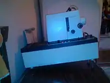 In 1979–1980 the DuKane Corporation in St. Charles, Illinois began to produce a cassette automatic filmstrip projector called the DuKane Micromatic II. The La Belle Commpak system used a 1000 Hz tone on 8-track tape to advance to the next slide. The General Electric Show'N Tell record system used 16mm for film, and record for audio (though the Show'N Tell would advance the film at a fixed rate through a gear).