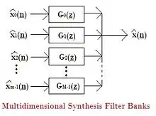 If there is no loss in the decomposition and the subsequent reconstruction, the filter bank is called perfect reconstruction. (in that case we would have .[7] Figure shows a general multidimensional filter bank with N channels and a common sampling matrix M. The analysis part transforms the input signal into N filtered and downsampled outputs . The synthesis part recovers the original signal from by upsampling and filtering. This kind of setup is used in many applications such as subband coding, multichannel acquisition, and discrete wavelet transforms.