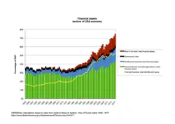 In the 1970s, the financial sector comprised slightly more than 3% of total Gross Domestic Product (GDP) of the U.S. economy,[12] while total financial assets of all investment banks (that is, securities broker-dealers) made up less than 2% of U.S. GDP.[13] The period from the New Deal through the 1970s has been referred to as the era of "boring banking" because banks that took deposits and made loans to individuals were prohibited from engaging in investments involving creative financial engineering and investment banking.[14]