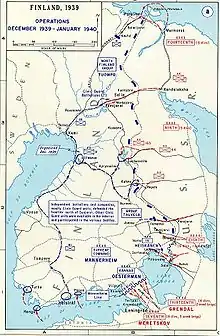 The Winter War was fought in three stages: the initial Soviet advance, a short lull, and then a renewed Soviet offensive.[17] The war was fought mainly in three areas. The Karelian Isthmus and the area of Lake Ladoga were the primary focus of the Soviet war effort. A two-pronged attack was launched in this region, with one pincer engaging Finnish forces on the Isthmus while the other went around Lake Ladoga in an attempt at encircling the defenders. This force was then to advance to and capture the city of Viipuri. The second front was in central Karelia, where Soviet forces were to advance to the city of Oulu, cutting the country in half. Finally, a drive from the north was intended to capture the Petsamo region.[18] By late December the Soviets had become bogged down, with the two main fronts at a standstill as the Finns counterattacked with greater strength than anticipated. With the failure of two of its three offensives by the end of December, Soviet headquarters ordered a cessation of operations. By 27 December, it was observed that the Soviets were digging in on the Karelian Isthmus.[19] In the north, the Finns had been pushed back to Nautsi, but with reinforcements, had been able to take the higher ground and halt the Soviet advance south of Petsamo. During this period the Finns harassed supply columns and carried out raids against fortified Soviet positions.[20] A lull followed in January 1940, as the Soviet army reassessed its strategy, and rearmed and resupplied.[21] On 29 January, Molotov put an end to the puppet Terijoki Government and recognized the Ryti government as the legal government of Finland, informing it that the USSR was willing to negotiate peace.[22][23]