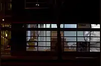 As the viewer draws close to the image, the special glass projection material, Smart glass, causes portions of the imagery to disappear as the projection surface switches from translucent to clear, fragmenting the image and frustrating its coherence: the immediate environment suddenly becomes part of the mis en scene. Thus the viewer is suddenly transitioned from a conventional indexical observer to the here and now; experiencing their immediate environment. Another feature of the work that speaks to the construction and fragility of the image(es), is the rate at which transitions occur from one image (such as a particular individual or background layer of the tableau) to another. These transitions can last up to two minutes, causing individuals pictured or the backgrounds they are set upon to disappear very gradually: creating ghost-like residues of once crisp images as they fade away.