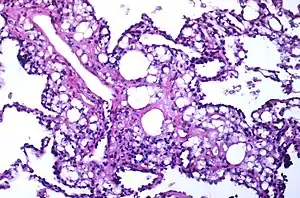 Fire breather's pneumonia is a distinct type of exogenous—that is, originating outside the body—lipoid pneumonia (chemical pneumonitis) that results from inhalation or aspiration of hydrocarbons of different types, such as lamp oil.[1] Accidental inhalation of hydrocarbon fuels can occur during fire breathing, fire eating, or other fire performance, and may lead to pneumonitis.