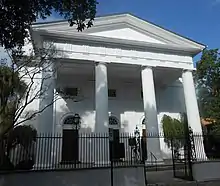 First Baptist Church is a Baptist church in Charleston, South Carolina. It is affiliated with the Southern Baptist Convention. The congregation was founded in 1682 under the leadership of William Screven. It is one of the oldest Baptist congregations in the American South. The church congregation was originally organized in Kittery, Maine (then part of Massachusetts) under the guidance of the First Baptist Church of Boston. In 1696 twenty-six congregants followed Pastor Screven and moved to Charleston after being pressured by the New England Congregationalist authorities. The relocated congregation became the First Baptist Church of Charleston. Pastor Screven recommended that any future pastor be "orthodox in faith, and of blameless life, and does own the confession of faith put forth by our brethren in London in 1689" declaring the church to be firmly Calvinist (Reformed Baptist).[1] First Baptist Church is currently affiliated with the Southern Baptist denomination.[2][3][4] The current Greek Revival sanctuary was designed by Robert Mills and built in 1820.[5]