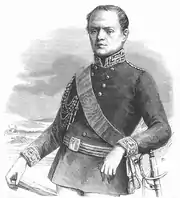 The Piedmontese army was headed by Charles Albert, Minister for War General Antonio Franzini,[10] and General Eusebio Bava. The latter directly commanded the 1st armed corps, consisting of two divisions under Generals Federico Millet d'Arvillars and Vittorio Garretti di Ferrere. The 2nd armed corps was directed by Ettore De Sonnaz, with Giovanni Battista Federici and Mario Broglia commanding its two divisions. The 5th division, containing the reserves, was under the command of Charles Albert's heir Victor Emmanuel, Duke of Savoy.[11] Finally, command of the artillery fell to Ferdinand of Savoy, Duke of Genoa.[12]