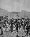George Berkeley records that the Italian casualties were 6,133 men killed: 261 officers, 2,918 white NCOs and privates, 954 permanently missing, and about 2,000 ascari. Another 1,428 were wounded – 470 Italians (including 31 officers) and 958 ascari. With 1,865 Italians and 1,000–2,000 ascaris taken prisoner.[41][42] Richard Caulk estimates that the number of Italians killed were 300 officers, 4,600 Italian rank and 1,000 askari for a total of 5,900 dead. As well as and 1,000 of those who escaped wounded and at least 2,000 captured. Citing contemporary figures, Caulk records Ethiopian losses to be 3,886 killed and 6,000 wounded.[43] Whereas Berkeley estimates Ethiopian losses to be 7,000 killed and 10,000 wounded.[44][40] In their flight to Eritrea, the Italians left behind all of their artillery and 11,000 rifles, as well as most of their transport.[40] As Paul B. Henze notes, "Baratieri's army had been completely annihilated while Menelik's was intact as a fighting force and gained thousands of rifles and a great deal of equipment from the fleeing Italians."[45] 800 captured Eritrean Ascari, regarded as traitors by the Ethiopians, had their right hands and left feet amputated, some were even castrated.[46][47] The Italian prisoners were generally treated better. Although, about 70 Italian prisoners were massacred in retaliation for the death of Bashah Aboye, the officer responsible for the massacre was supposedly imprisoned by Menelik.[48][49][50]