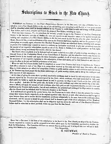 This first church building, really only a lecture hall was only forty by fifty feet in size, it was a wooden building constructed per a contract with Mr. John Stacy, a church member. Authorized on December 24, 1822; and built on land donated by Joseph Ellicott (November 1, 1760 – August 19, 1826) of the Holland Land Company on December 12, 1820; the total cost of construction was $874; Mr. Stacy, however, deducted the cost of a pew for his own use. Thus, money raised from pew sales totaled $100 in excess over the cost of construction. This humble edifice, located on the northwest parcel of land at Main, Church & Niagara Streets was completed in May 1824. The building was on the northeast corner of the plot of land at Pearl Street and Niagara Street with the front of the building facing east, it had two doors in the front with the pulpit standing between those doors. Inside, the pews were square and were lit by candles supplied by the worshipers in the evening, at the west end of the building was a platform for the singers.