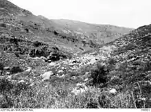 Moving up the eastern bank of the river to the north of the infantry, the 1st Light Horse Brigade got about 1 mile (1.6 km) north of the El Mandesi ford; halfway between the Ghoraniyeh crossing and Umm esh Shert.[64] The 1st and 3rd Light Horse Regiments (1st Light Horse Brigade) moved to protect the left or northern flank of the 60th (London) Division, and to cooperate with this infantry division, in their attack on Es Salt, while the 2nd Light Horse Regiment (1st Light Horse Brigade) remained in the rear to occupy the Es Salt road from the foothills to the high plateau; here good water was found in Wadi Ralen which was developed by engineers.[62][72][73][Note 9]