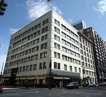 The Fisher brothers were unusually innovative,[5] and the firm's buildings are in a variety of styles. The Railway Exchange Addition of 1909/13 and the connected Railway Exchange New Building of 1937 (now the Hotel Monaco) in downtown Denver show contrasting styles by the same firm. The New Building, by Fisher, Fisher & Hubbell, is one of Denver's best Art Moderne works,[6] although the architects denied at the time that it was "modernistic".[7]