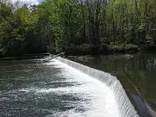 There are five dams on Fishing Creek.[41] The lowhead dam called Boone's Dam is the furthest downstream, in Montour Township.[27][41] It is 4.5 feet (1.4 m) high and 253 feet (77 m) long. Further upstream is the Diverting Dam, a 2-foot (0.6-meter) high and 100-foot (31-meter) long dam in Bloomsburg.[41] It was built to power the nearby Irondale furnaces.[27][42] A 380-foot (120 m) wide and 5-foot (1.5 m) high unnamed dam is on the creek further upstream, in Mount Pleasant Township. The uppermost dams are the 130-foot (40 m) wide and 11-foot (3.4 m) high Benton Dam and the 150-foot (46 m) wide and 6-foot (1.8 m) high Mill Dam, which are in Benton Township and Benton. Additionally, the Jonestown Dam is on the tributary Huntington Creek in Jonestown. This dam is 8 feet (2.4 m) high and 120 feet (37 m) wide.[41]