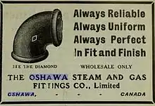 In 1902, Oshawa industrialist J.D. Storie partnered with H.T. Carswell and William Cowan, of Ontario Malleable Iron Company[5] to purchase the former site occupied by the Oshawa Stove Company on 135 Bruce Street, and created the Oshawa Steam and Gas Fittings, Ltd. Cowan became the president of the firm; Storie, the vice-president and general manager, and Carswell as the secretary-treasurer.[6] Their intent was to create a firm that would specialize in malleable iron pipe fittings, railway fittings, and chain.[7] In 1910, the owners simplified the company name to Fittings Limited, name that would remain throughout the life of the company.