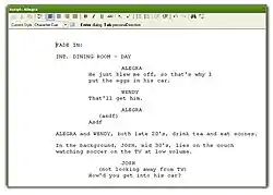 - Editor - vScripter's scriptwriting editor included features typical of scriptwriting software such as (a) proper formatting as recommended by AMPAS[1] Nicholl Fellowship in Screenwriting; (b) writing accelerators such as intelligent tab-and-enter key processing; and (c) character and location memory for auto-completion typing.