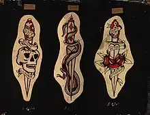 The development of electric tattoo machines in the 1890s enabled faster and more precise tattooing.[5] More tattoo artists started to work from shops as a full-time profession.[4] To fulfill increased demand for tattoos, especially sailor tattoos, artists bought and sold sets of pre-drawn designs.[6] These "flash" designs were on larger sheets of paper than sketchbook pages, intended to be framed and hung on walls.[4] Many of these designs were relatively simple — with black outlines, limited colors, and limited shading — to enable quick work.[6] Skilled professional tattoo artists sold flash to other artists, who were seeking out quality designs to advertise to potential customers.[4] This process of selling and buying attractive sets of designs helped shape American traditional tattooing into a more consistent genre.[4]