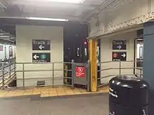 - Cox, Jeremiah (July 22, 2009). A single High Entrance/Exit Turnstile provides the only way to leave Track 2 at this exit except during rush hour when the turnstiles are open. Retrieved January 16, 2018.