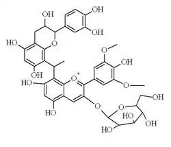 Flavanol-anthocyanin adducts are formed during wine ageing through reactions between anthocyanins and tannins present in grape, with yeast metabolites such as acetaldehyde. Acetaldehyde-induced reactions yield ethyl-linked species such as malvidin glucoside-ethyl-catechin.[1][2]