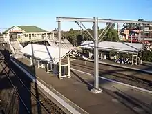 Flemington railway station consists of two island platforms. The northern one (platforms numbered 1 and 2) is not in regular use, and regular scheduled services only use the southern island platform (numbered 3 and 4). Stairs and lifts connect the platforms to an overhead concourse. The main village commercial centre of Flemington is south of the station, and the concourse descends to street level here via stairs and a lift. To the north of the station is the large market complex of Sydney Markets at the Flemington locality. The concourse is connected to the markets on the north side via a long, elevated walkway which spans across the freight line tracks and former goods sidings and continues into the market complex.