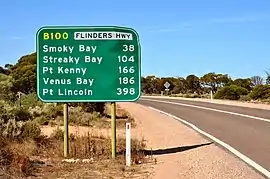 Flinders Highway connects the South Australian towns of Ceduna and Port Lincoln, a distance of 396 kilometres (246 mi)[1] Flinders Highway - along with Lincoln Highway - presents an alternative but somewhat longer coastal route between Ceduna and Port Augusta, compared to the more direct route along Eyre Highway.[3] It is designated route B100.
