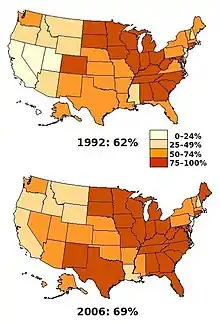 By 1965, Greater Dublin's water was fluoridated; by 1973, other urban centers were too.[102] Studies from the late 1970s to mid 1990s showed a decrease in (and lower incidence of) dental decay in school children living in areas where water was fluoridated than in areas where water was not fluoridated.[103] The government of the Republic of Ireland has yet to carry out a public health survey on the effects of fluoridation, even though this is required to under the 1960 Health (Fluoridation of Water Supplies) Act.[104]