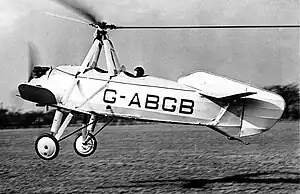 The final variant was the solitary C.19 Mk V, G-ABXP.[3] The aircraft-style controls of earlier autogyros depended on airflow past ailerons, rudders and elevators; during the slow forward speed phases of takeoff and landing, these were ineffective, and accidents resulted. The C.19 Mk V lacked the small wing and all-moving control surfaces, relying instead on a tilting rotor head. Using a long control arm that reached to the rear cockpit, the pilot could direct the aircraft by tilting the plane of rotation of the rotor. After a period of experimentation, the C.19 Mk V flew with a small fixed tailplane and a two-bladed rotor. This control system was adopted for the Cierva C.30.