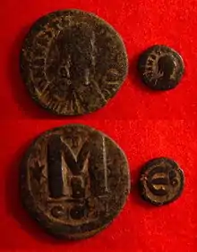 The follis was reintroduced as a large bronze coin (40 nummi) in 498, with the coinage reform of Anastasius, which included a series of bronze denominations with their values marked in Greek numerals. A 40 nummi coin of Anastasius is depicted on the obverse of the 50 Macedonian denar banknote, issued in 1996.[3]