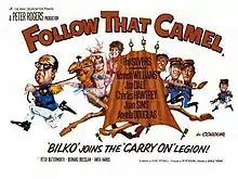 Follow That Camel is a 1967 British comedy film, the 14th in the series of 31 Carry On films (1958–1992). Like its predecessor Carry On Don't Lose Your Head, it does not have the words "Carry On" in its original title (though for screenings outside the United Kingdom it was known as Carry On In The Legion, and it is alternatively titled Carry On ... Follow That Camel). It parodies the much-filmed 1924 book Beau Geste, by PC Wren, and other French Foreign Legion films. This film was producer Peter Rogers's attempt to break into the American market; Phil Silvers (in his only Carry On) is heavily featured in a Sergeant Bilko-esque role.[2] He appears alongside Carry On regulars Kenneth Williams, Jim Dale, Charles Hawtrey, Joan Sims, Peter Butterworth and Bernard Bresslaw. Angela Douglas makes the third of her four Carry On appearances. Anita Harris makes the first of her two Carry On appearances. The film was followed by Carry On Doctor 1967.