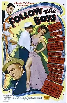 Follow the Boys also known as Three Cheers for the Boys is a 1944 musical film made by Universal Pictures during World War II as an all-star cast morale booster to entertain the troops abroad and the civilians at home. The film was directed by A. Edward "Eddie" Sutherland and produced by Charles K. Feldman. The movie stars George Raft and Vera Zorina and features Grace McDonald, Charles Grapewin, Regis Toomey and George Macready. At one point in the film, Orson Welles saws Marlene Dietrich in half during a magic show. W.C. Fields, in his first movie since 1941, performs a classic pool-playing presentation he first developed in vaudeville four decades earlier in 1903.[2]