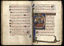 The Fontevraud Gradual (often known as the Gradual of Eleanor of Brittany) is an antiphonary or gradual of the mid-13th century, owned by Eleanor of Brittany (d. 1342), abbess of Fontevraud Abbey, and bequeathed to the abbey on her death.[1] It contains Gregorian chant as well as three early polyphonic pieces. It is also noted for its miniatures in the form of historiated initials.