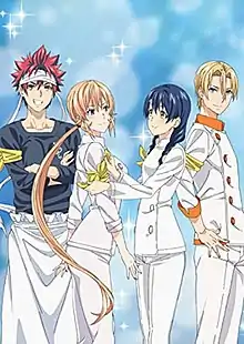 ![]() Back cover art of the first Blu-ray compilation, featuring Soma Yukihira (far left), Erina Nakiri (left), Megumi Tadokoro (right), and Takumi Aldini (far right). | |