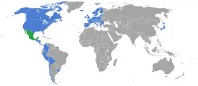 Mexico is one of the founding members of several international organizations, most notably the United Nations,[11] the Organization of American States,[12] the Organization of Ibero-American States,[13] the OPANAL[14] and the Rio Group.[15] For a long time, Mexico has been one of the largest contributors to the United Nations regular budget, in 2008 over 40 million dollars were given to the organization.[16] In addition, it was the only Latin American member of the Organisation for Economic Co-operation and Development since it joined in 1994 until the accession of Chile in 2010. Mexico is considered as a newly industrialized country,[17][18] a regional power[19][20] and an emerging market,[21] hence its presence in major economic groups such as the G8+5 and the G-20 major economies.