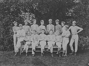 Forest had an important role in the development and creation of association football, and the Common at the front of the school may well be regarded as a "cradle of the game".[1] In the school's early years there was no sport apart from informal kick-abouts by the pupils, but by the 1840s cricket was played and hockey was in vogue in the early 1850s. Football began at Forest in 1857 when Frederick Guy took over as headmaster; it was played on The Common, at the front of the school. The Common was a rather uneven playing surface, with the great chestnut trees at the side of the pitch "in play" and some famous iron railings marking the north end of the pitch. Tradition records some great battles between Charles W. Alcock and F.J. Poole, in which the object was to barge the other player over the iron railings![2] The earliest reported match against another school was in Forest's first season on 24 February 1858, when Forest beat Chigwell School 5-4 on The Common.[3] Another early game was on Saturday 16 November 1861, when Forest School, (playing as "Walthamstow"), lost to a Westminster School side (playing as "Bounding Bricks") by three goals to nil.[4] A return match was played four weeks later, and in 1862 the school played against Old Westminsters (playing as Elizabethan Club).[5]