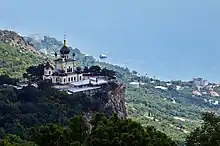 The Church of Christ's Resurrection (Russian: Воскресенская церковь, romanized: Voskryesyenskaya tserkov'; Ukrainian: Церква Воскресіння Христового, romanized: Tserkva Voskresinnya Khrystovoho) is a popular tourist attraction close to the southernmost tip of the Crimea, known primarily for its scenic location, overlooking the Black Sea littoral from a 400-metre cliff near Baidarsky Pass.